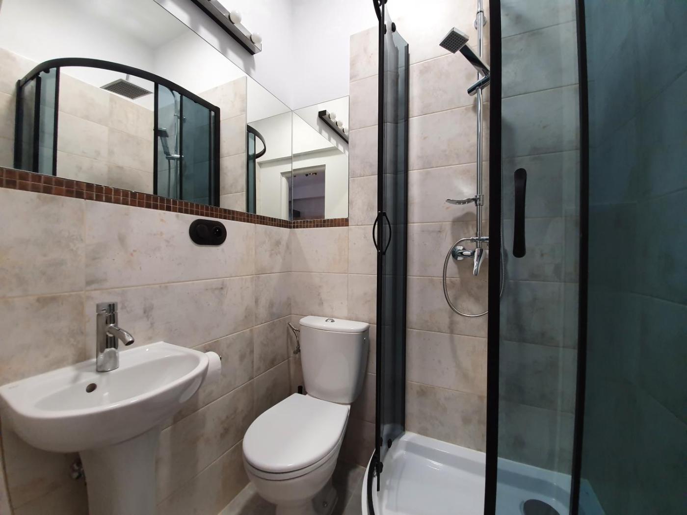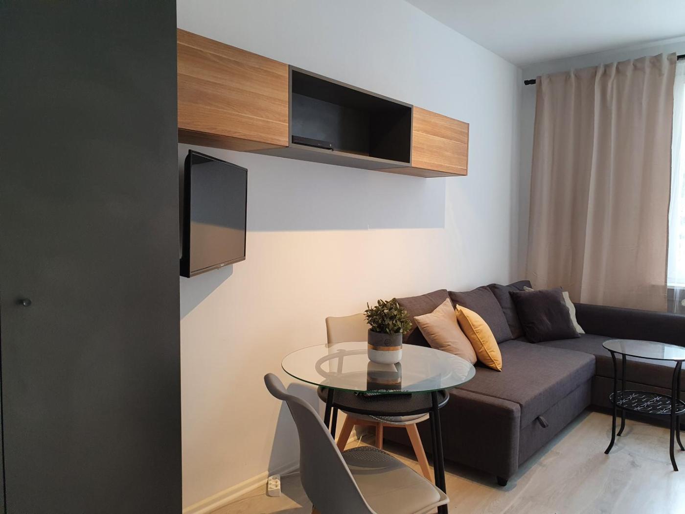 Studio. The studio features a washing machine, a dining area, as well as a private bathroom boasting a shower. Guests can make meals in the kitchenette that features a refrigerator, kitchenware and an electric kettle. The studio provides a wardrobe, parquet floors, heating, as well as a flat-screen TV. The unit has 1 bed. Studio - 2 osobowy. Powierzchnia pokoju ok.: 20 mkw.