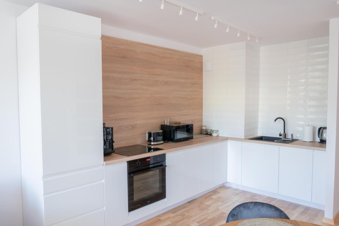 Oferta apartamentu obejmuje sypialnię (1), salon, aneks kuchenny z pełnym wyposażeniem, w tym lodówką i ekspresem do kawy, a także łazienkę (1) z prysznicem oraz suszarką do włosów. W apartamencie zapewniono ręczniki i pościel.